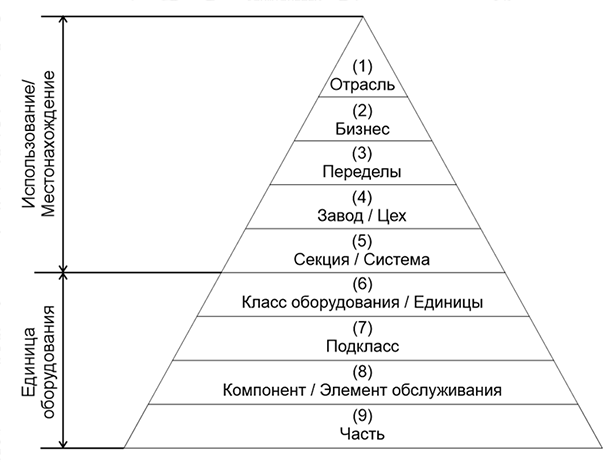 Иерархия формализуется с помощью кодификации активов, которая обеспечивает комплексную основу для сбора данных о надежности и техническом обслуживании (RМ) в стандартном формате для оборудования на всех объектах и операциях производства в течение жизненного цикла эксплуатации оборудования.